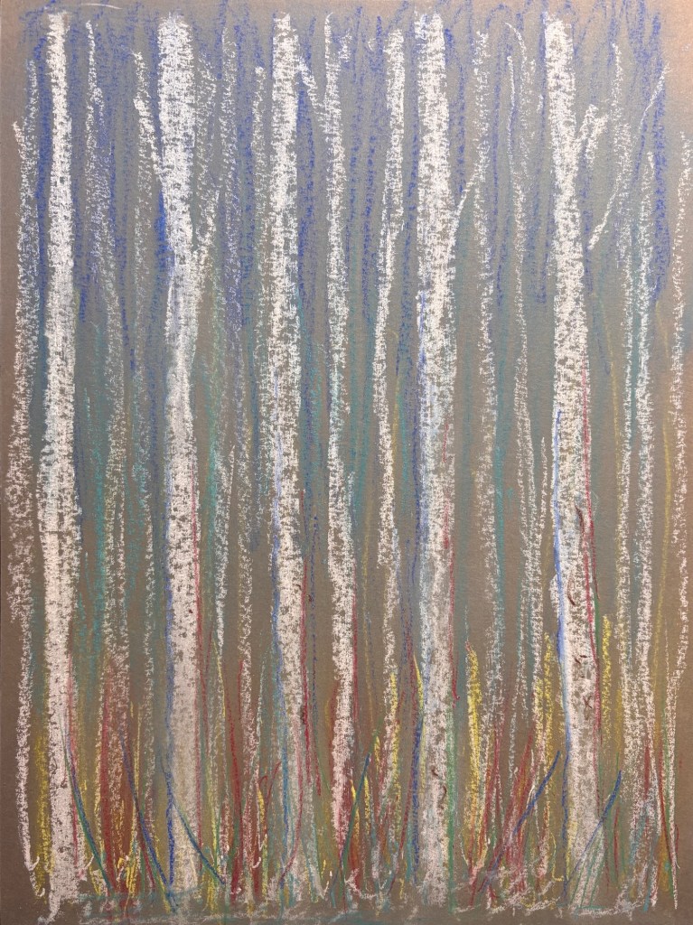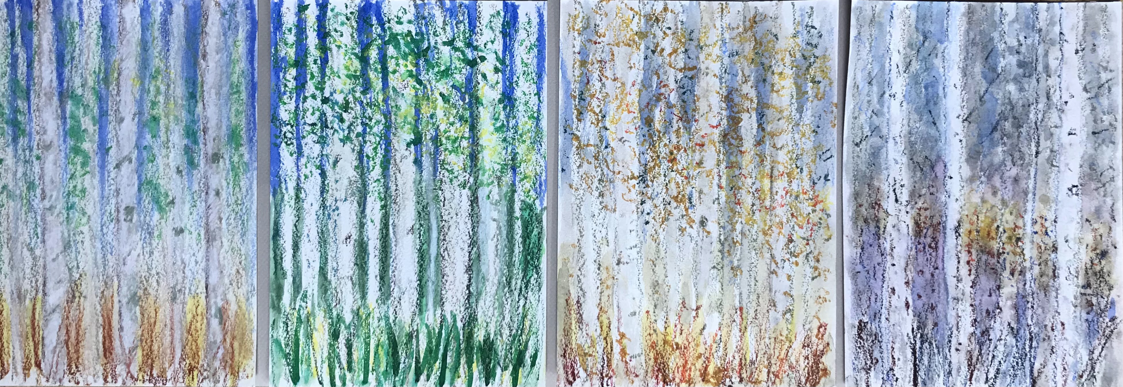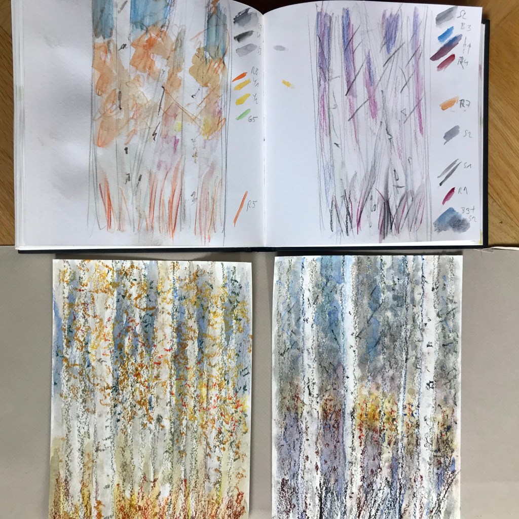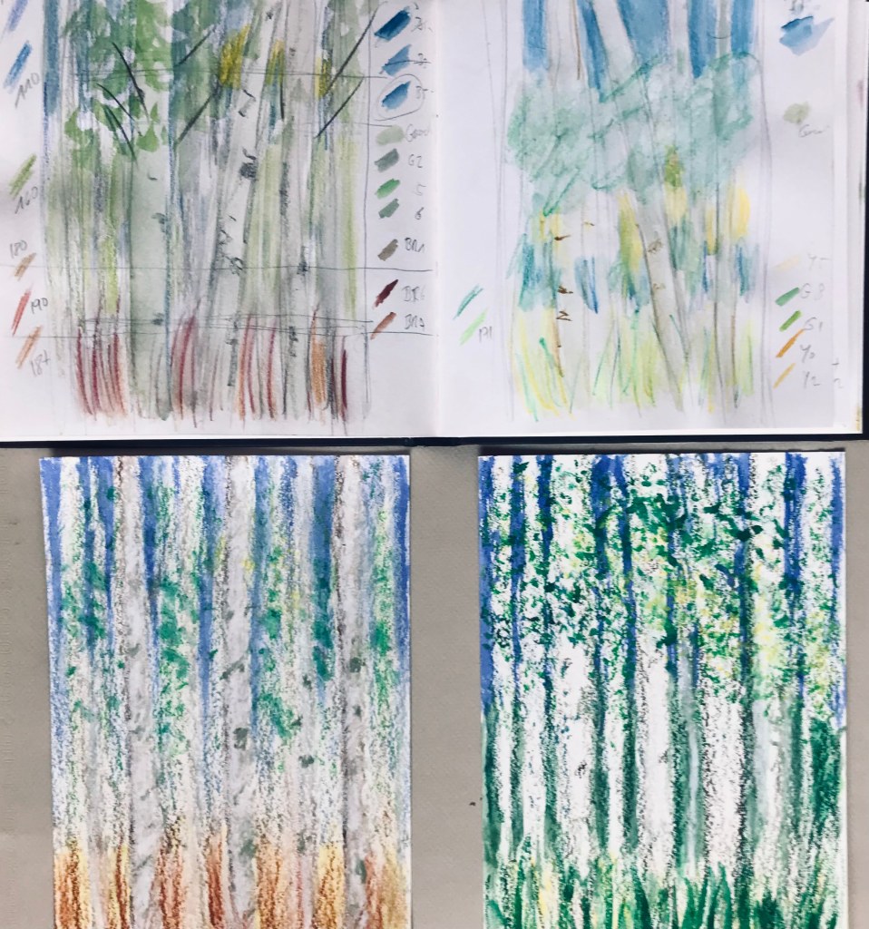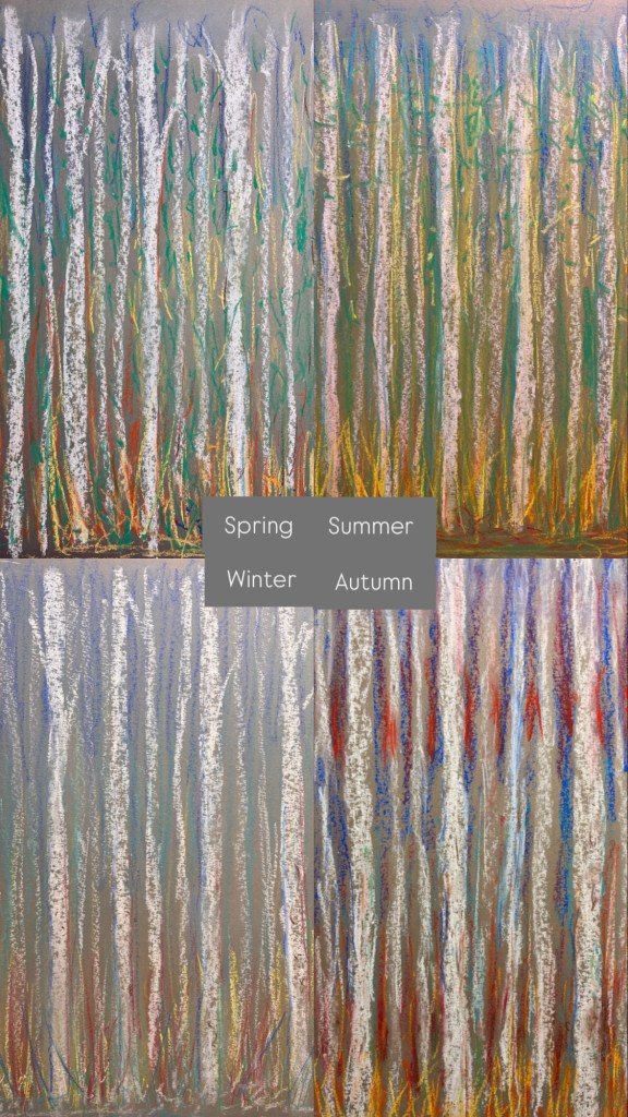 Continuing the tree theme, I have been studying birches throughout the year. Recently, I started a new project on four seasons in a birch forest. My first sketches were in watercolour pencils, followed by four small sketches with oil pastels, iridescent ink, and aquadrop watercolour. The vertical trees in the foreground against a backdrop of further trees and the sky, more vertically placed are the sun light, branches, and leaves in seasonal colours, at the bottom the underwood bushes.