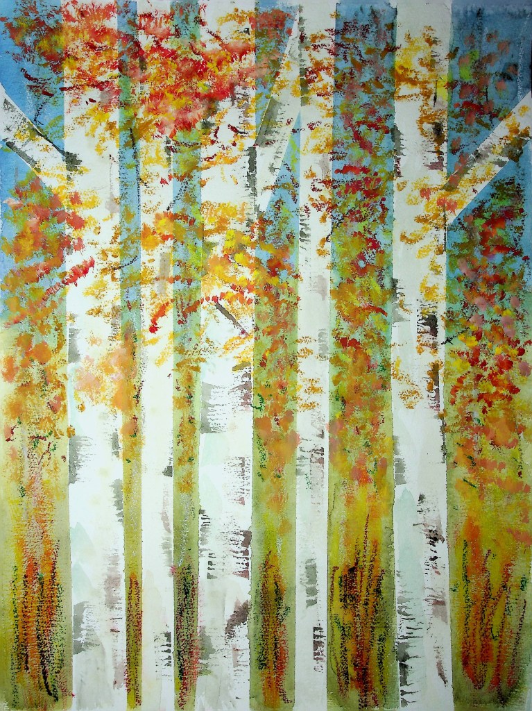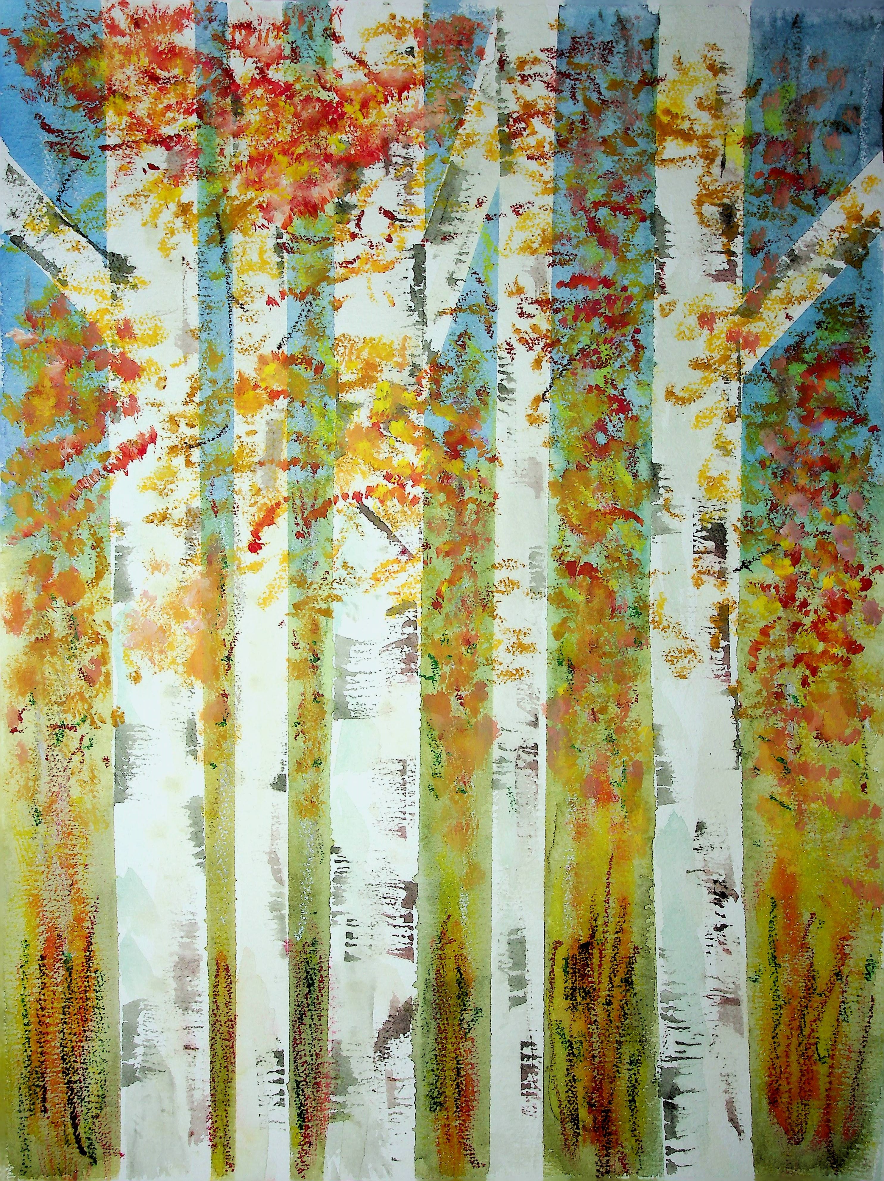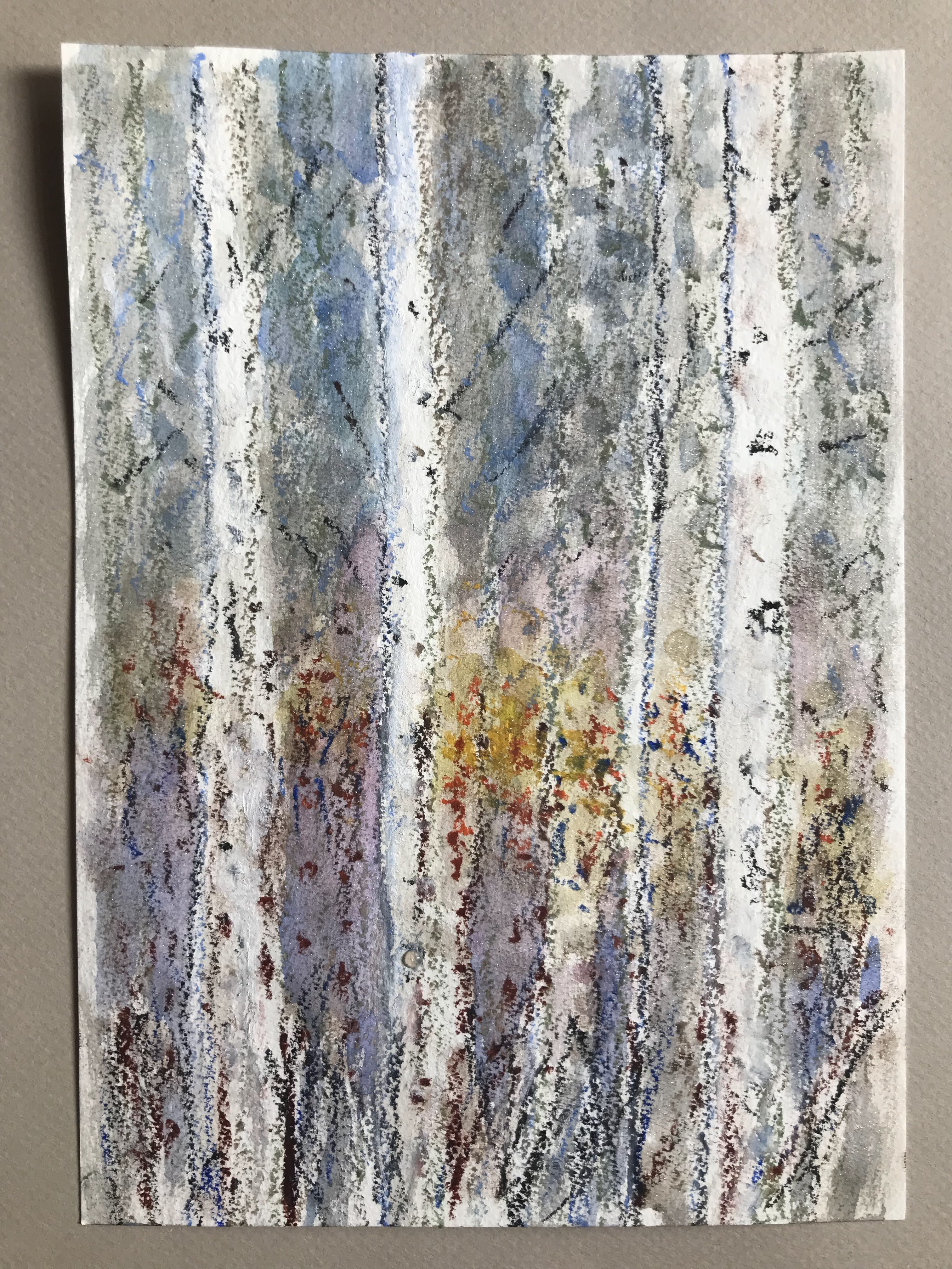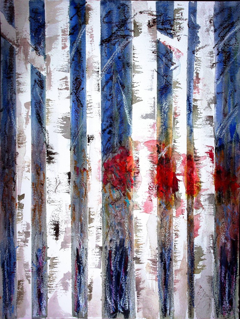 Continuing the tree theme, I have been studying birches throughout the year. Recently, I started a new project on four seasons in a birch forest. My first sketches were in watercolour pencils, followed by four small sketches with oil pastels, iridescent ink, and aquadrop watercolour. The vertical trees in the foreground against a backdrop of further trees and the sky, more vertically placed are the sun light, branches, and leaves in seasonal colours, at the bottom the underwood bushes.